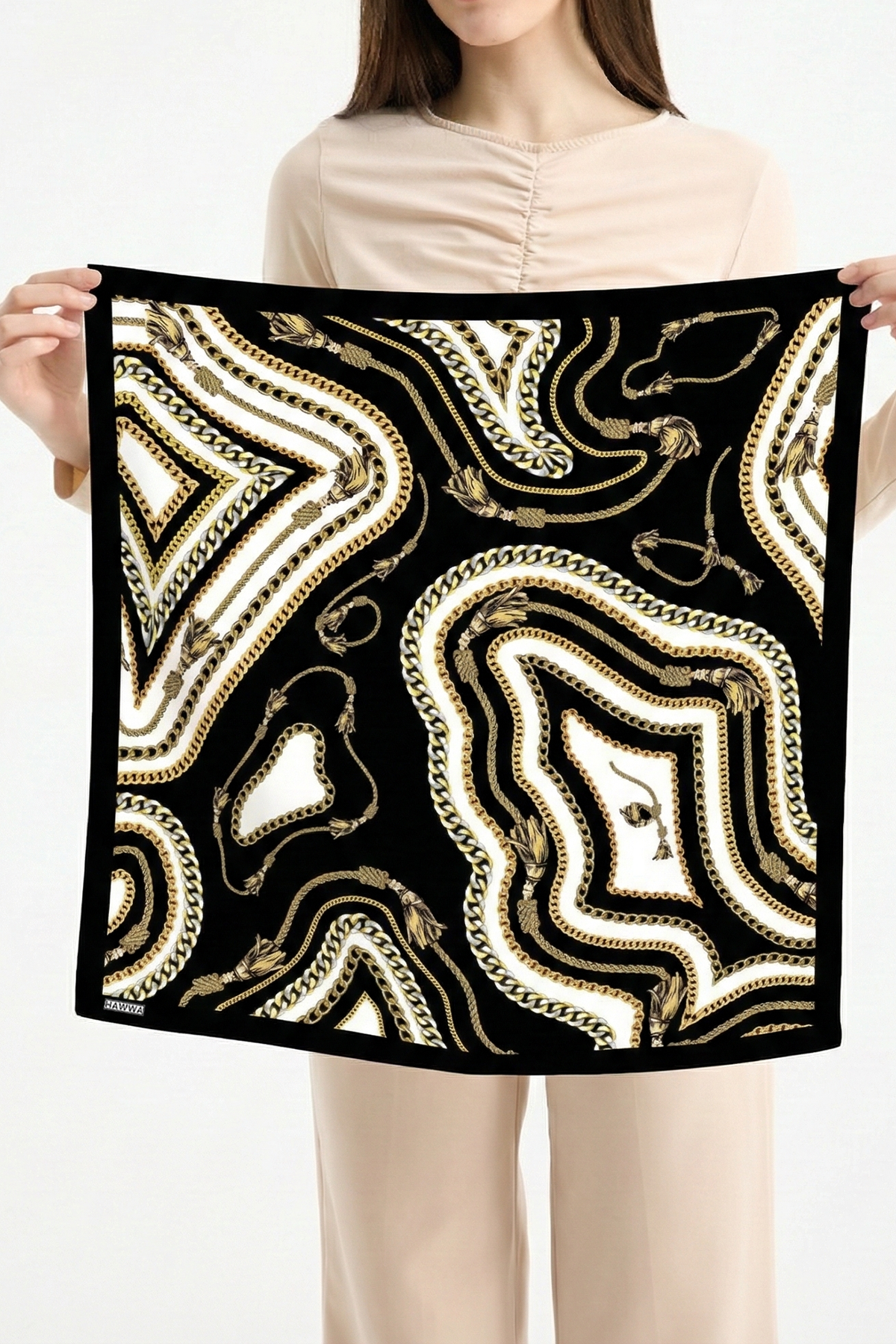 Hawwa’nın seçkin koleksiyonundan Altın Bağ Desenli Bandana Fular, şıklığı ve zarafeti bir araya getirir. Yumuşak dokulu rayon saten kumaşı, ışığı doğal biçimde yansıtarak ipeksi bir görünüm kazandırır. Kompakt 55x55 cm ölçüsü, hem boyun fularında hem saç aksesuarında hem de çanta süslemede çok yönlü kullanım sağlar.
