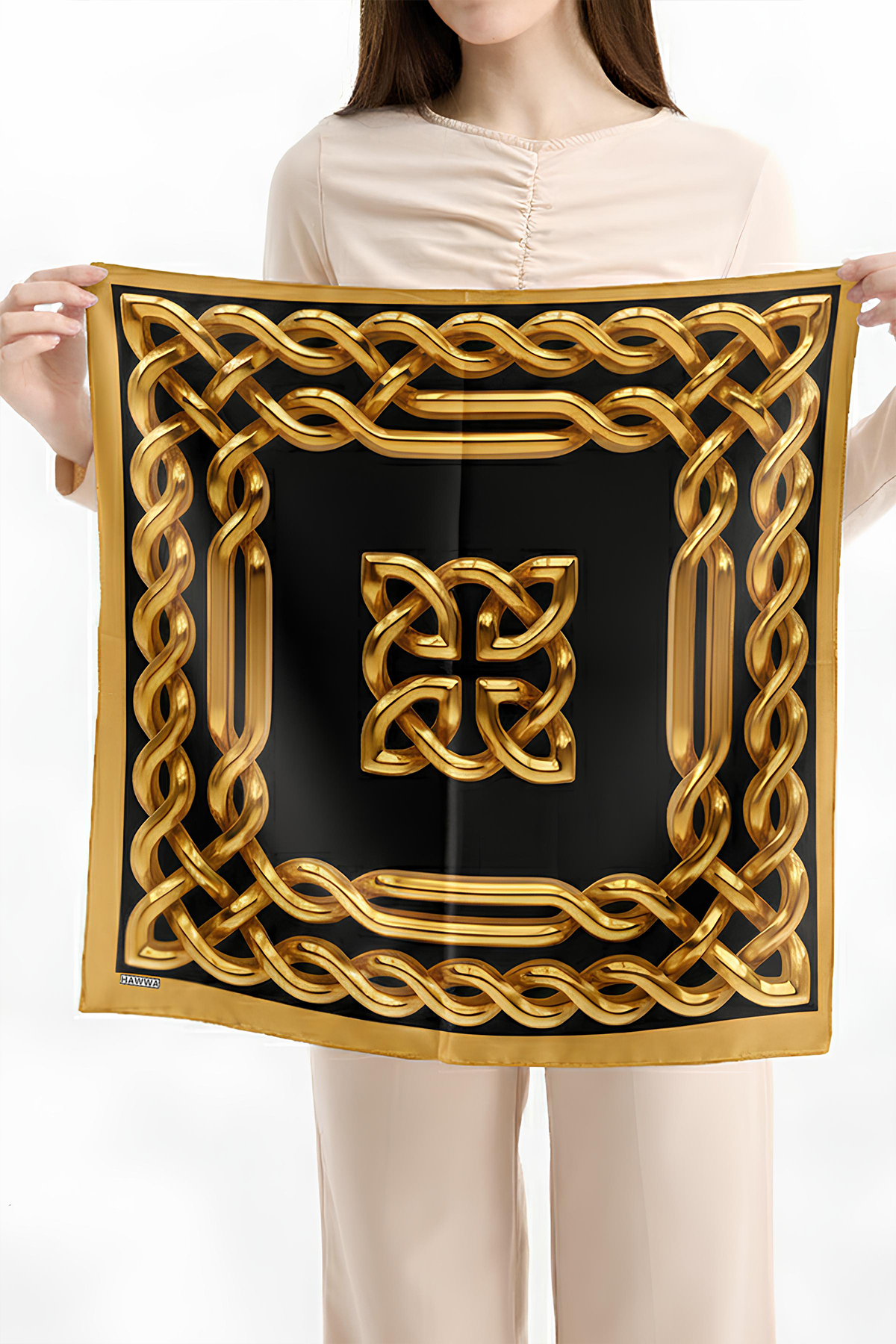 Hawwa’nın seçkin koleksiyonundan Altın Zincir Desenli Bandana Fular, şıklığı ve zarafeti bir araya getirir.