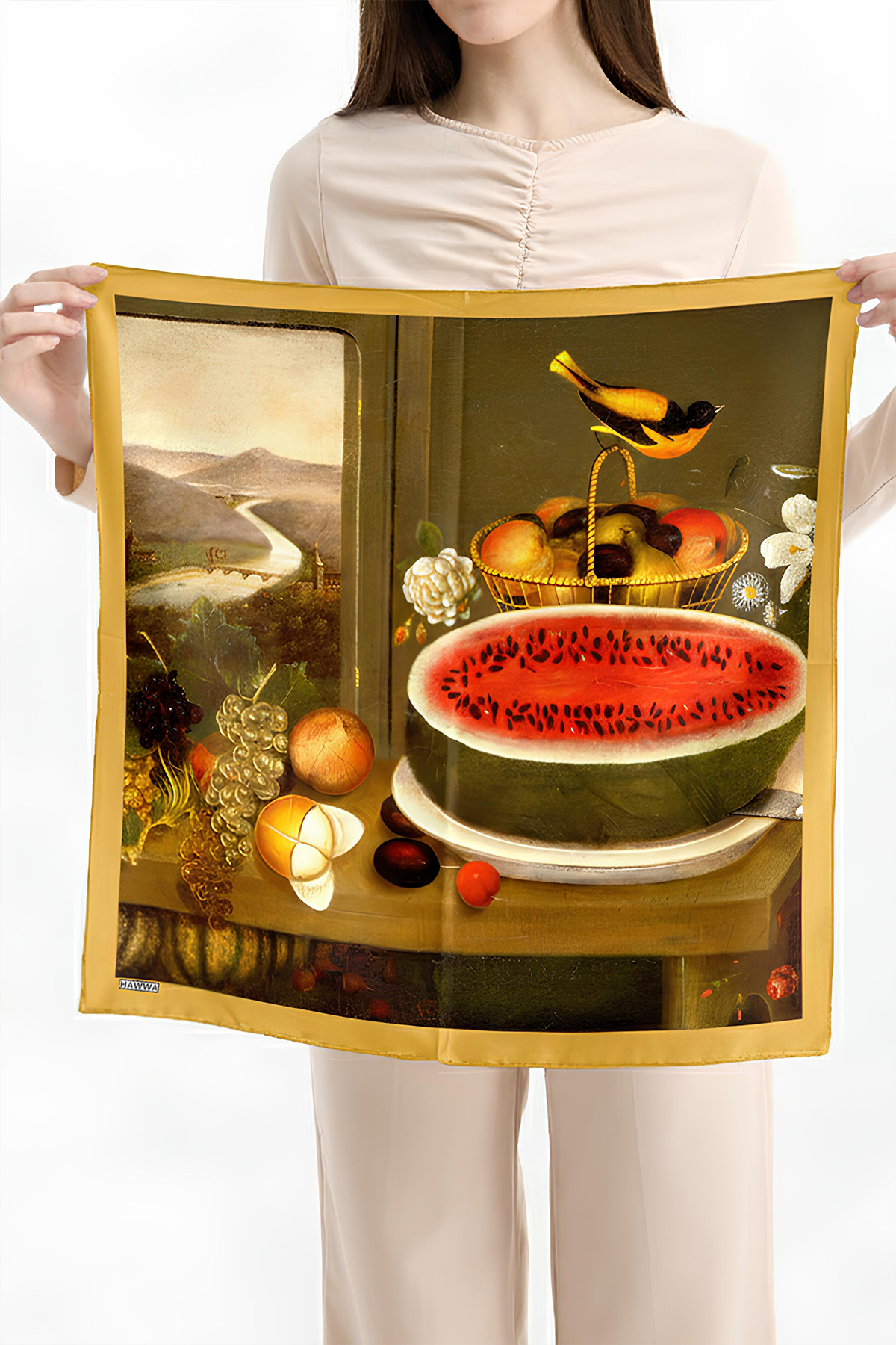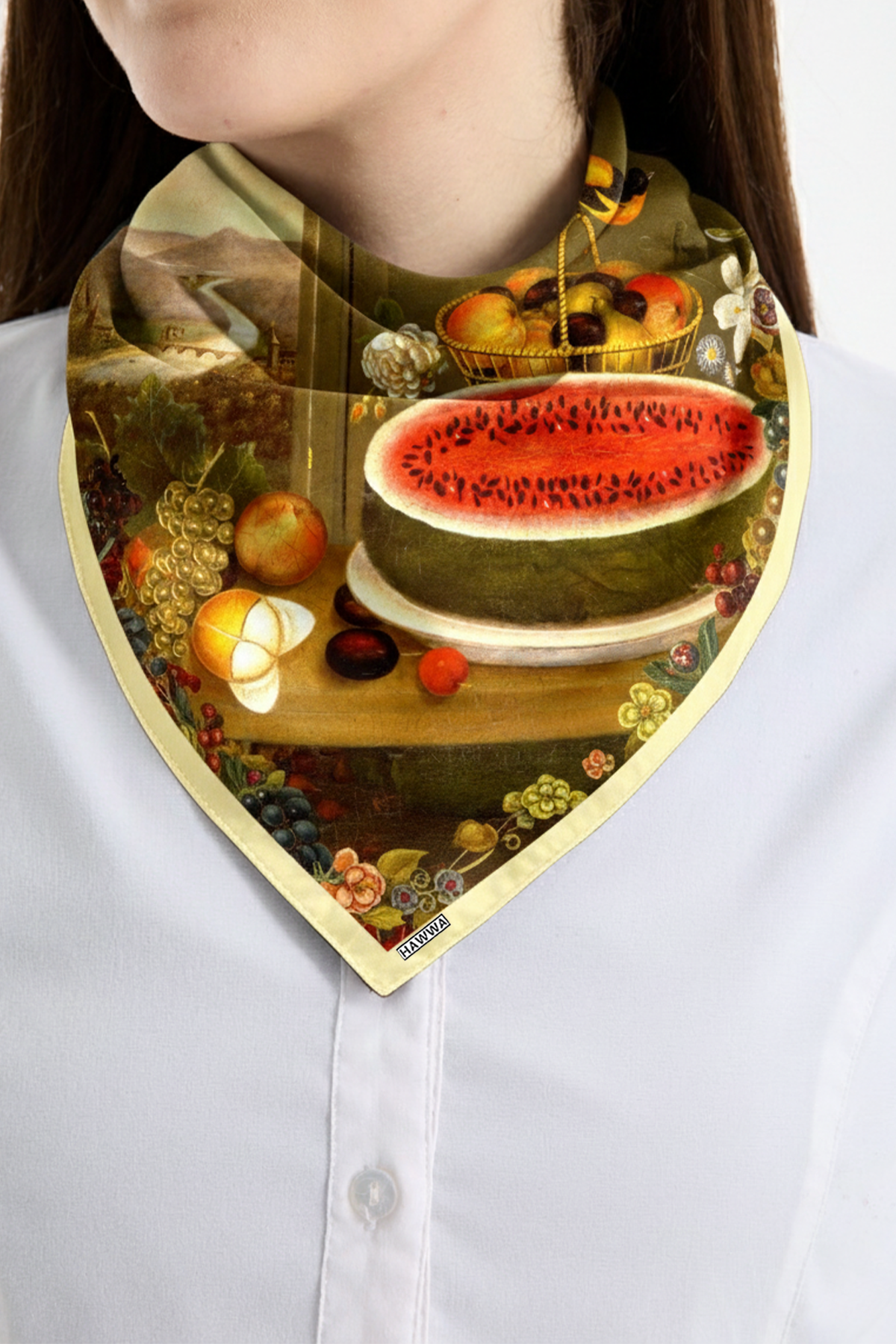 Hawwa’nın seçkin koleksiyonundan Meyve ve Kuş Desenli Bandana Fular, şıklığı ve zarafeti bir araya getirir.