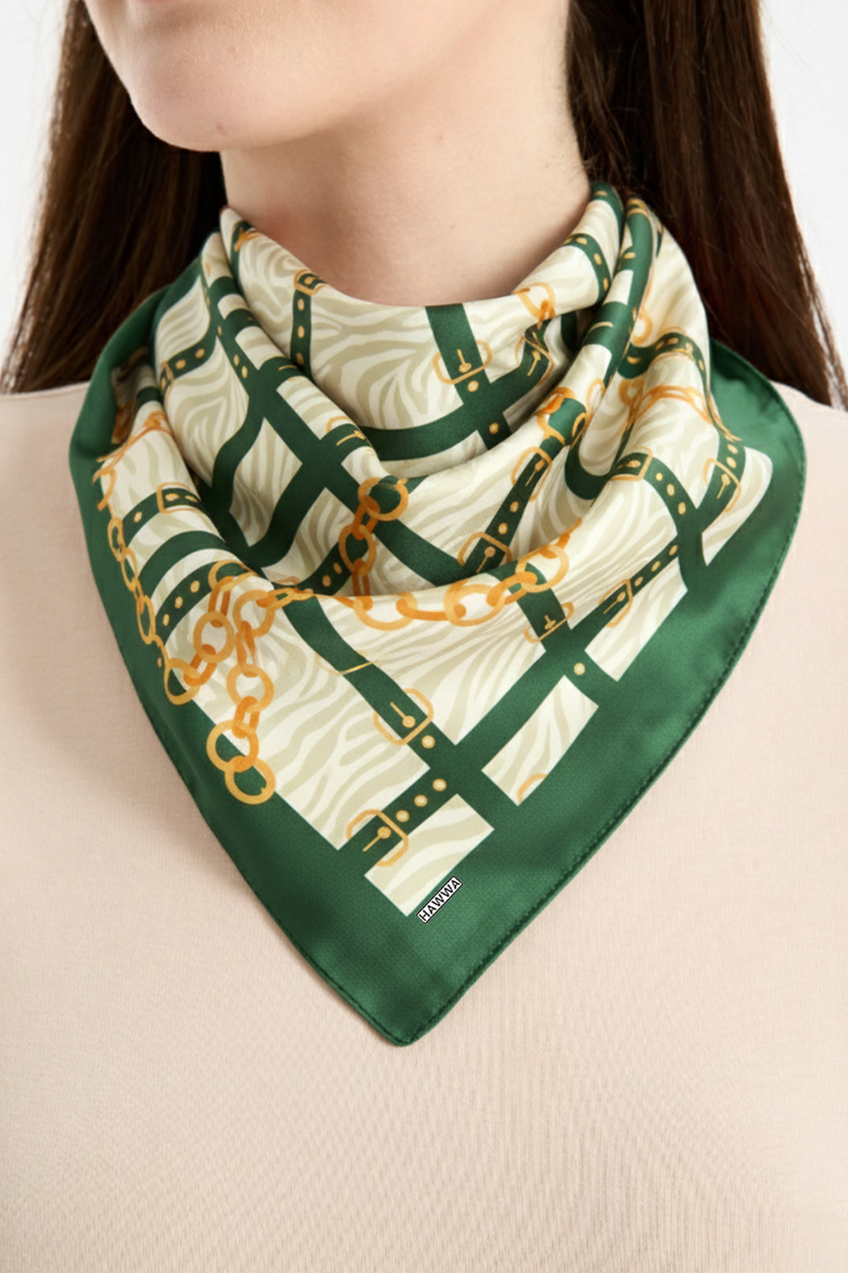 Hawwa’nın seçkin koleksiyonundan Zincir ve Kemer Desenli Bandana Fular, şıklığı ve zarafeti bir araya getirir.